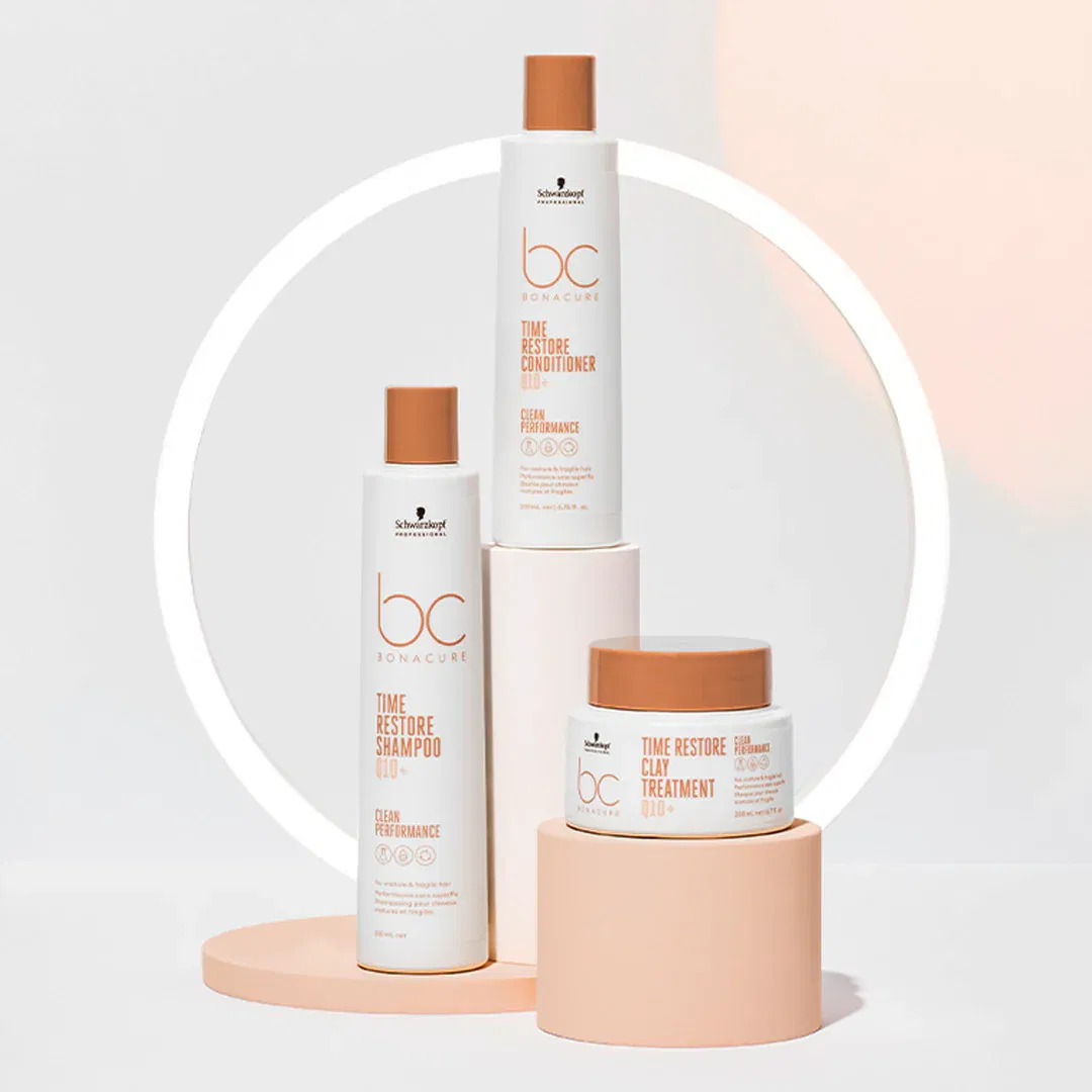 Shampoo tratante de Bonacure Time Restore, especialmente formulado con Q10+, que limpia suavemente y fortifica el cabello maduro. Libre de sulfatos SLS/SLES, siliconas y colorantes artificiales. Su fórmula ayuda a eliminar los signos visibles del envejecimiento para un cabello suave y brillante al instante.